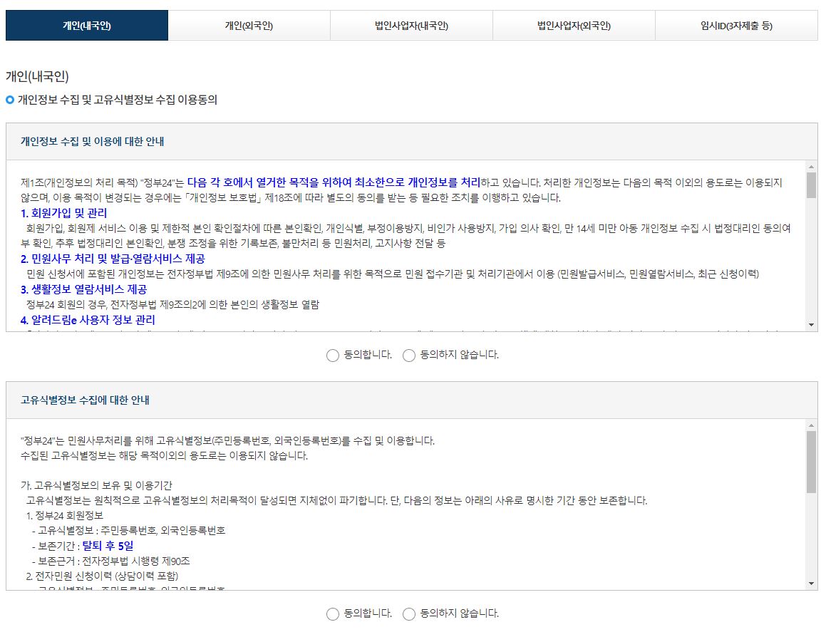 보통 비회원으로 넉넉하게 활용하는 서비스라서, 먼저는 비회원 요청하기로 진행해볼게요. 비회원으로 신청하시면, 개인 데이터 수집 및 이용과 고유식별데이터 수집에 대해서 동의해주셔야 합니다.