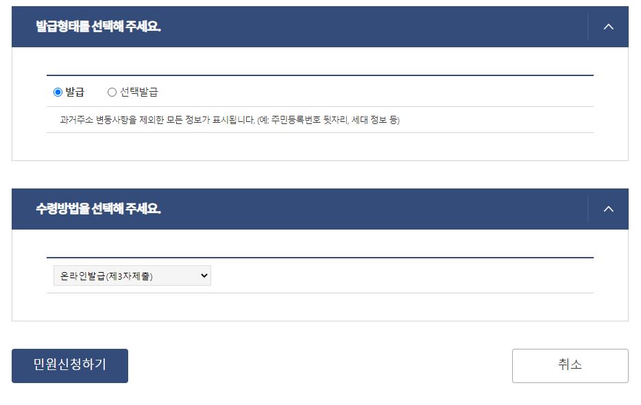 그런다음 발급형태에서 발급 또는 선택발급을 고르는 것이 나오는데 발급을 선택하게되면 옛날 주소 변동사항을 제외한 대개 데이터가 표시된 상태로 서류가 발급돼요. 만에 하나 선택발급을 선택하면, 예전주소 변동사항이나, 주민등록번호 뒷자리등 불필요한 부분은 배제하고 발급신청할 수 있습니다. 그러니 요구되는 데이터를 확인하시고 선택하시면 돼요.